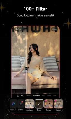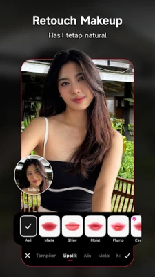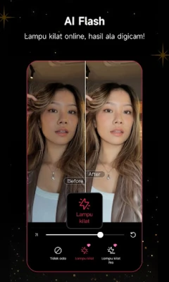 Ubah setiap momen visual Anda menjadi karya seni yang memukau dengan Meitu, platform penyuntingan all-in-one yang dirancang untuk mempercantik foto, video, dan selfie Anda secara profesional dan estetik. Manfaatkan kecanggihan teknologi AI kami, mulai dari AI Lampu Kilat yang secara cerdas menerangi gambar redup, memastikan ketajaman dan kecerahan optimal di setiap kondisi cahaya, hingga AI Beautify yang menyempurnakan potret Anda dengan sekali sentuh. Fitur ini secara otomatis menghaluskan kulit, mencerahkan area mata, membentuk wajah, dan menyempurnakan senyum Anda untuk hasil alami yang memukau.