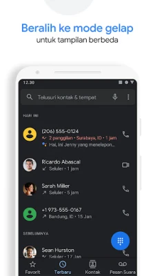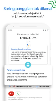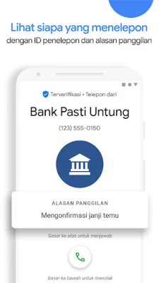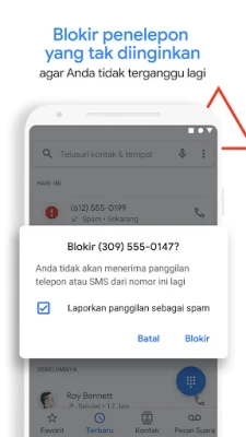 Rasakan pengalaman berkomunikasi yang lebih cerdas dan aman dengan Aplikasi Telepon. Kami hadir untuk mengubah cara Anda berinteraksi dengan panggilan, membekali Anda dengan perlindungan mutakhir terhadap gangguan tak diinginkan. Dapatkan peringatan real-time untuk panggilan mencurigakan dari spammer, telemarketer, dan penipu, memungkinkan Anda menghindarinya dengan mudah. Dengan sekali ketuk, blokir nomor-nomor yang mengganggu agar tidak pernah lagi mencapai Anda. Didukung oleh cakupan data nomor telepon Google yang luas, Aplikasi Telepon juga secara akurat mengidentifikasi panggilan dari bisnis terpercaya, memastikan Anda selalu tahu siapa yang menghubungi, dan dapat menjawab dengan keyakinan penuh.
