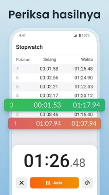 Bagi mereka yang mendambakan akurasi waktu yang tak tertandingi, Timer + Stopwatch: Jam Digital juga dilengkapi dengan fitur stopwatch kelas profesional. Dirancang untuk keakuratan hingga milidetik, ini adalah perangkat yang ideal bagi para atlet yang melacak performa, penggemar kebugaran yang mengukur latihan, atau siapa pun yang membutuhkan pengukuran waktu yang presisi. Dengan kemampuan pencatatan putaran (lap), Anda dapat dengan mudah memantau kemajuan, menganalisis data, dan mengidentifikasi area peningkatan. Tampilan yang jernih dan mudah dibaca memastikan Anda selalu selaras dengan setiap detiknya, tanpa ada gangguan.